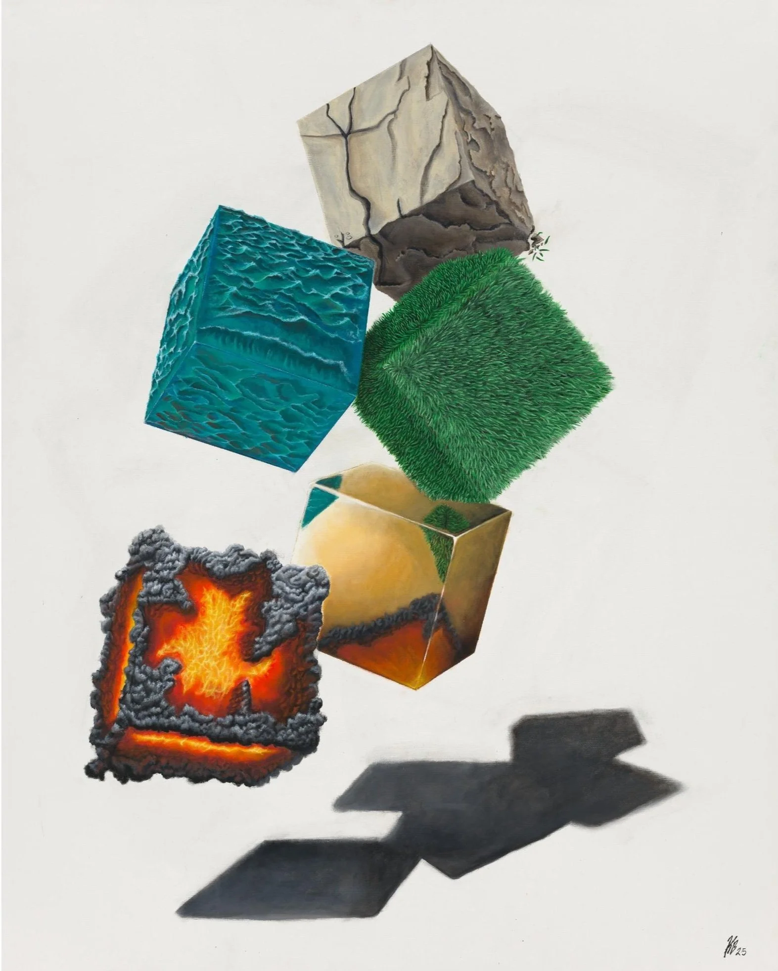 Fall of the 5 depicts the 5 Chinese elements: Earth, Tree, Water, Fire, and Metal (gold) falling toward an element-less desert. Each elements is destructively interacting with another.