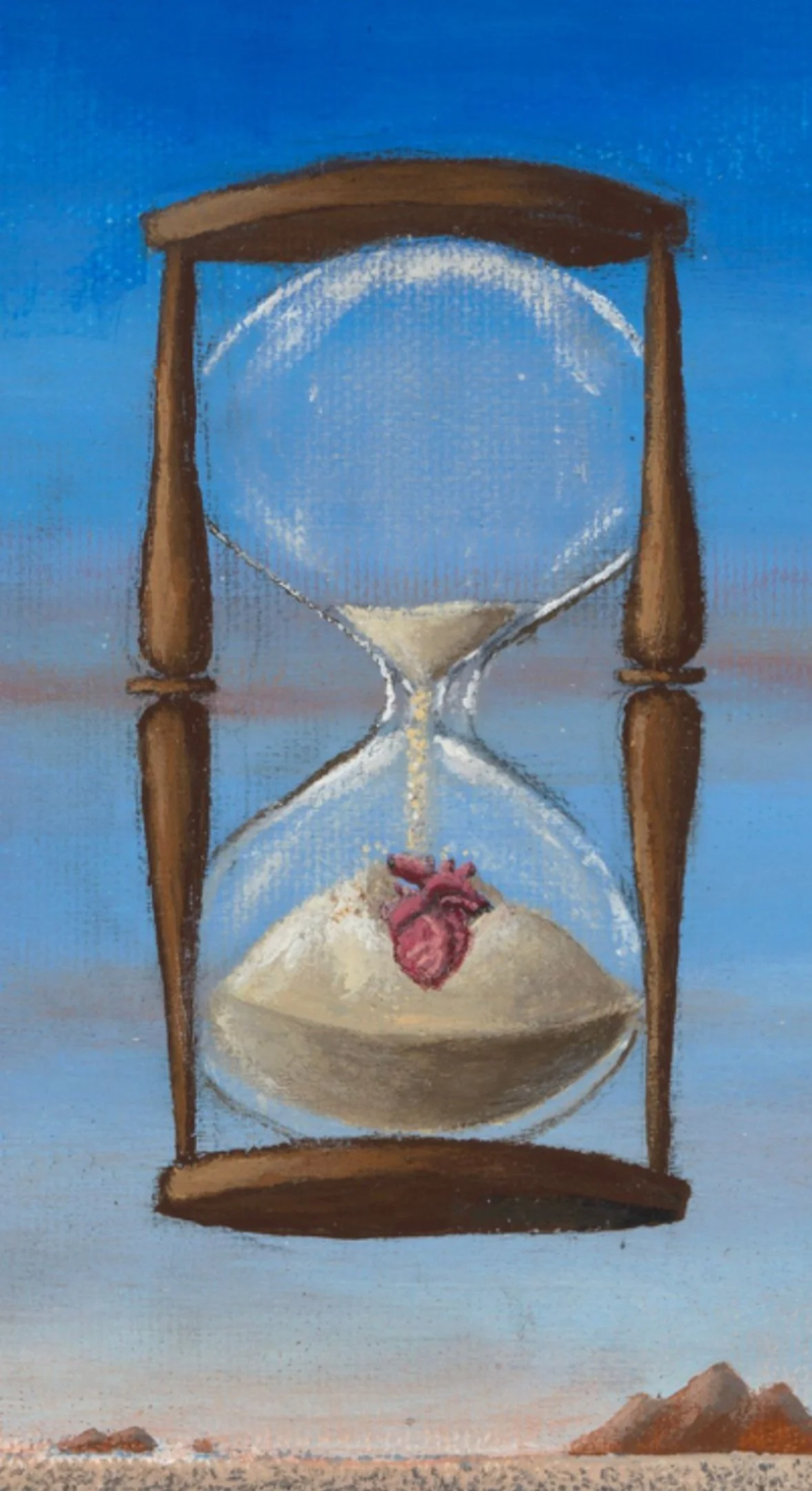 Symbolically representing time as the dominant force in the universe. The anatomical heart almost buried by the sands of the hourglass suggests the close and inevitable death of the world you see, lost to the sands of time.