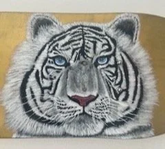 Acrylic painting on skateboard decks. The animal is paired with an associated celestial object. Tiger being solitary, paired with the sole sun in our solar system. The owl, a creature of the night, paired with the moon. The bear, an animal found on (almost) every continent on earth. Each animal has it’s celestial object in it’s pupil, giving it a “ying-yang” characteristic. Overall, the painting suggests that animals should only be captive to the universe, NOT cages or other forms of human confinement.