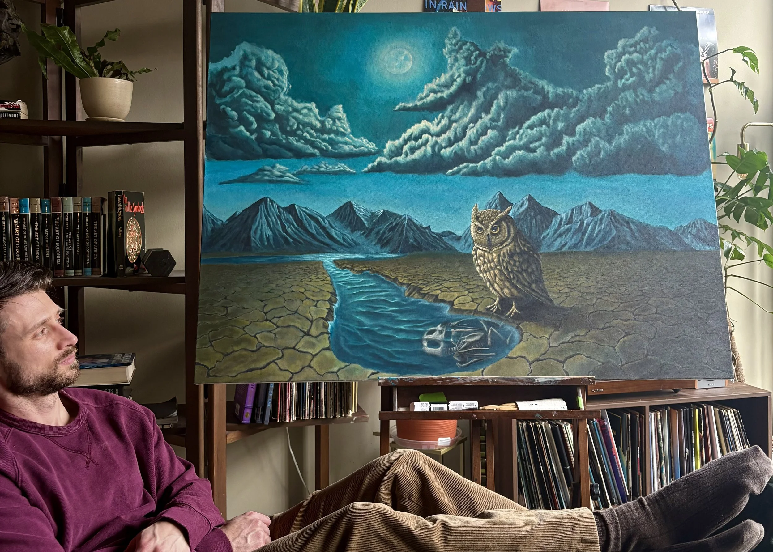 A lonely owl perches next to a river on a windy, moonlit night. The water appears to flow in abundance, but the ground beneath its feet suggests otherwise. What does remain, the water and the life it gives, reflects (literally) what will remain in its absence. A painting of inevitability and reflection.